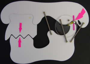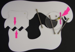 Notice how in Figure 2, the jawbone is seated in the socket, but the teeth do not mesh together. The teeth hit on hard, inclined surfaces so that when the teeth are clenched together; the jawbone is pulled forward in the socket (as indicated by the “broken” pink line at the right arrow in Figure 3 below). This is a system that is out of balance and over time we would expect to see signs and/or symptoms of this imbalance in one or more parts of the system.
